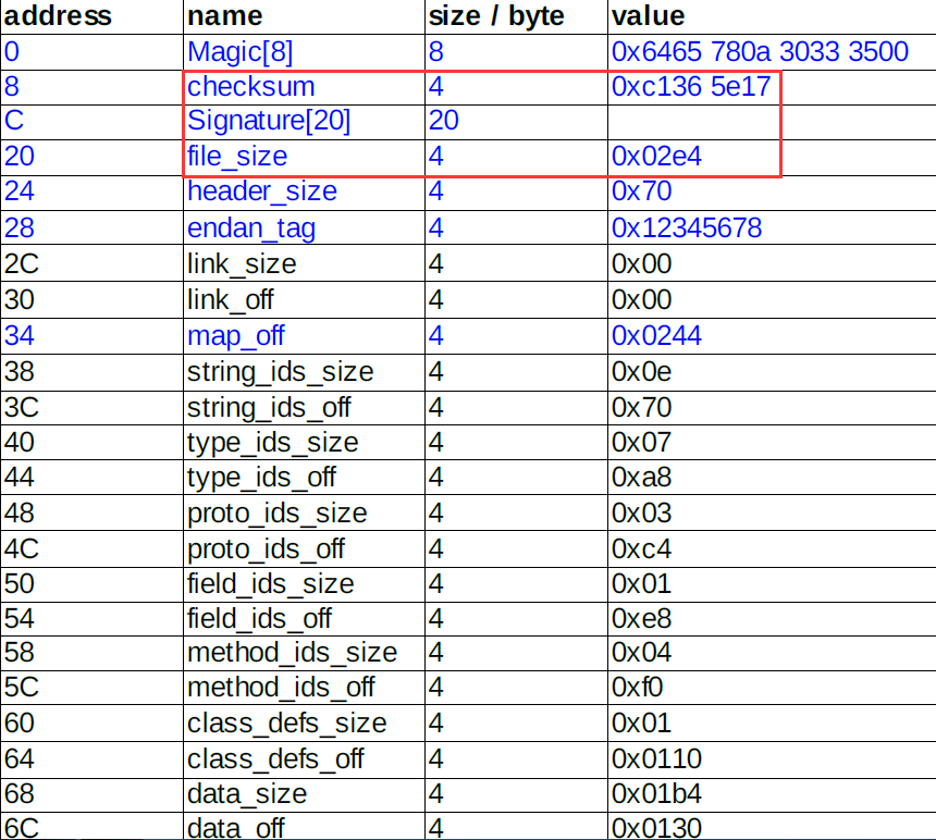 因为我们需要将一个文件(加密之后的源Apk)写入到Dex中,那么我们肯定需要修改文件校验码(checksum).因为他是检查文件是否有错误。那么signature也是一样,也是唯一识别文件的算法。还有就是需要修改dex文件的大小。