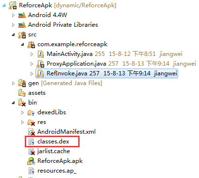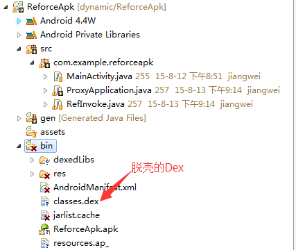 那么第一个文件我们都知道,就是上面的源程序编译之后的Apk文件,那么第二个文件我们怎么得到呢?这个就是我们要讲到的第三个项目:脱壳程序项目,他是一个Android项目,我们在编译之后,能够得到他的classes.dex文件,然后修改一下名称就可。