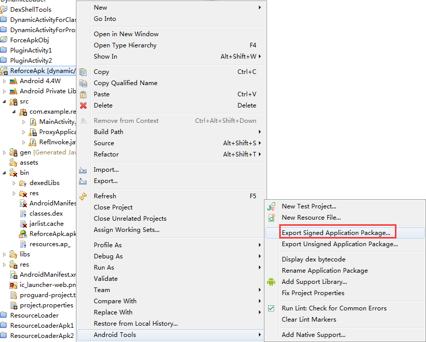 所以这里我们在得到ReforceApk.apk文件的时候,需要签名,关于Eclipse中如何签名一个Apk的话,这里就不多说了,自己google一下吧: