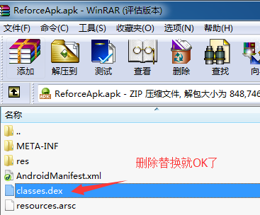 我们在第一步中得到加壳之后的classes.dex文件之后,并且我们在第一步运行脱壳项目的时候得到一个ReforceApk.apk文件,这时候我们使用解压缩软件进行替换: