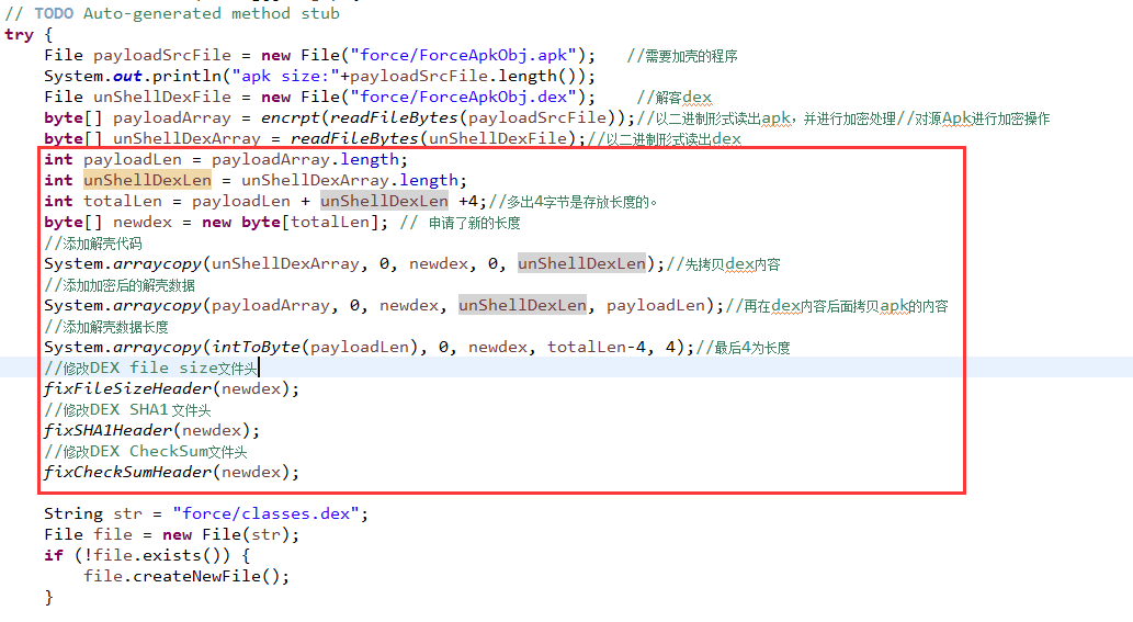 int payloadLen = payloadArray.length; int unShellDexLen = unShellDexArray.length; int totalLen = payloadLen + unShellDexLen +4;//多出4字节是存放长度的。 byte[] newdex = new byte[totalLen]; // 申请了新的长度 //添加解壳代码 System.arraycopy(unShellDexArray, 0, newdex, 0, unShellDexLen);//先拷贝dex内容 //添加加密后的解壳数据 System.arraycopy(payloadArray, 0, newdex, unShellDexLen, payloadLen);//再在dex内容后面拷贝apk的内容