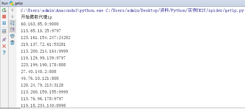 if __name__ == '__main__':path = 'ip.txt' # 存放爬取ip的文档pathtargeturl = 'http://www.cnblogs.com/TurboWay/' # 验证ip有效性的指定urlgetip(targeturl,path)