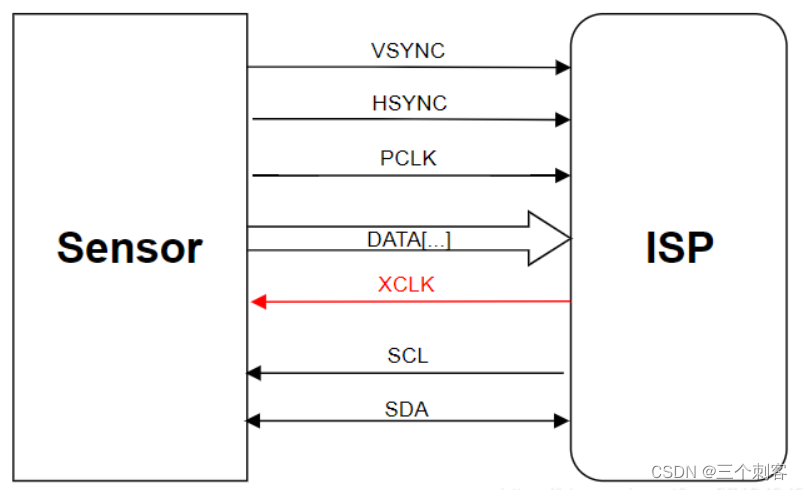 DVP(Digital Video Port) 是传统的sensor输出接口,采用并行输出方式,d数据位宽有8bit、10bit、12bit、16bit,是CMOS电平信号(重点是非差分信号),PCLK最大速率为96MHz,接口如下图: