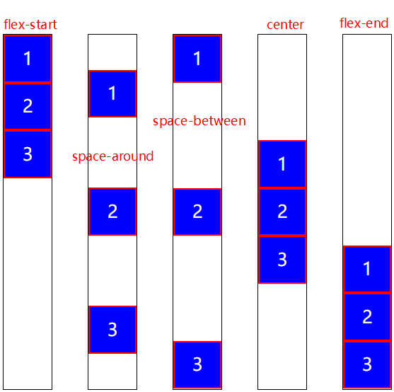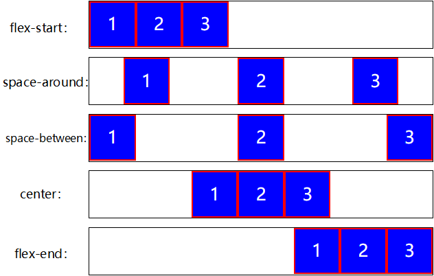 justify-content:设置在主轴方向上的子元素的排列方式属性值 描述 flex-start 沿主轴方向从左到右(从上到下)排列,默认值 flex-end 从主轴方向从右到左(从下到上)排列 center 居中对齐 space-around 平均分配剩余空间 space-between 两端贴边,中间仔平均分配剩余空间 水平方向: