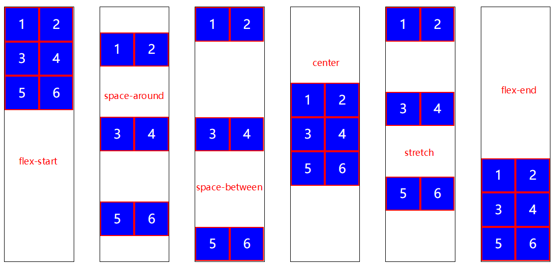 flex-wrap:wrap;属性值 描述 flex-start flex-end center space-around space-between stretch 水平方向: