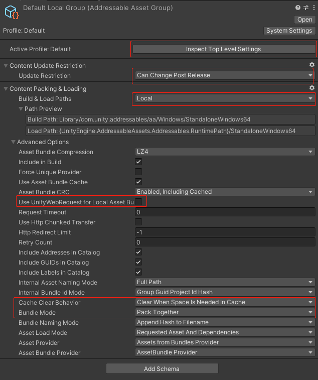 3.这个我通常会勾选,如果是想加载远程的资源,path选Remote,如果是只想加载local group里的资源(即放在StreamingAssets),没有加载远程资源的需求,选择Local即可