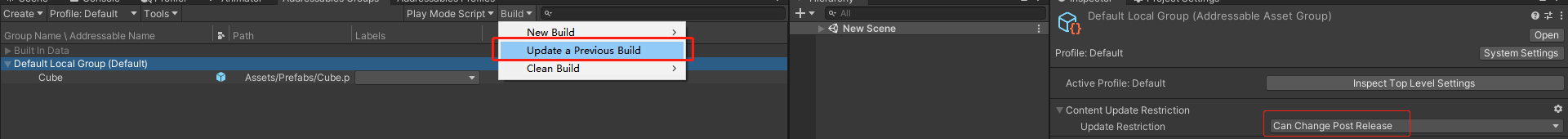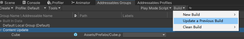 这里需要注意,当我们选择的更新形式是Can Change Post Release和Remote时,我们就采用上图的Update a Previous Build,然后选择你对应平台里的addressables_content_state.bin文件就可以打出新的ab包了