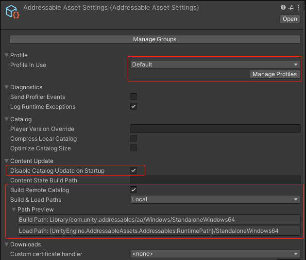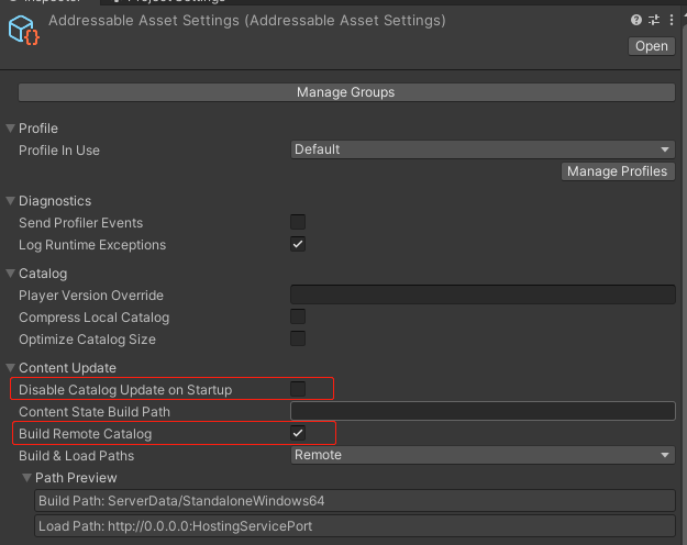2.Disable Catalog Update on Startup:这个勾选的话是说这个catalog不要在应用启动的时候就自动更新,等我们到了主界面,点击屏幕再更新,看看是否有更新,这个catalog保存的就是我们的资源信息,一般要做这种需要玩家确认下载的时候我会勾选这个,我也尝试过不勾选然后做无感更新也是可以的,即在App运行过程中有资源更新了,不需要退出再重新打开App或者返回主界面再更新,可以直接后台更新,然后再加载这个资源就是最新的资源了