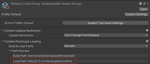 3.Local or Remote,如果是选择Remote的话,那么你还需要到Addressables Profiles里去设置你的远程资源地址,Remote.BuildPath我们通常不改,一般只改Remote.LoadPath,即使用你自己的资源服务器地址