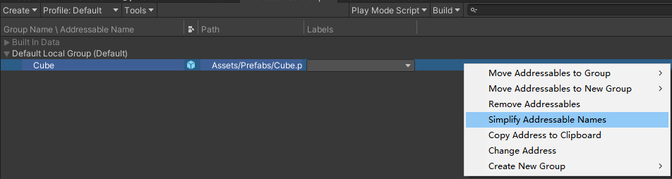2.将Cube拖到这个默认的Group下,然后单击或者右键选择下图简化名字,这个Name:"Cube"就是我们之后使用Addressables API加载Cube需要传入的参数名