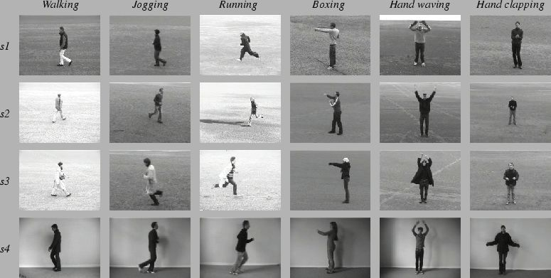 经典的动作识别数据集,也是目前文章中使用率较高的数据集之一。数据集一共包含2391组数据,其中包含6个动作,每个动作由25个人物在4个不同的场景下完成,因此一共有600个视频序列,每个视频又可以分割成4个子序列。KTH数据集的动作比较规范,同时采用固定镜头,数量对于目前的模型训练来说也比较丰富,所以对应单纯进行动作识别的任务可以说是非常好用的数据集了。同时,KTH在GitHub的处理的开源程序有很多,可以随时根据自己的需要进行参考。