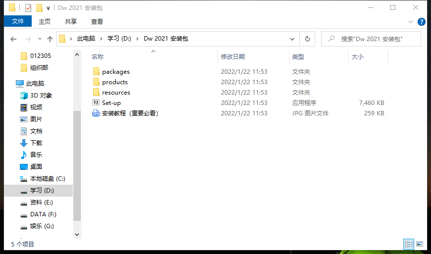 1.找到下载好的安装包,并双击打开【Dw 2021 安装包】文件夹