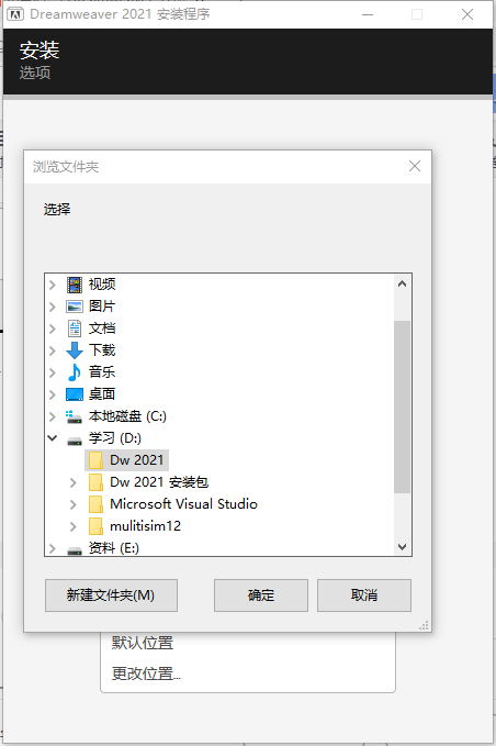 5.选择安装位置,然后点击【新建文件夹】将文件夹名称修改为【Dw 2021】,然后点击确定