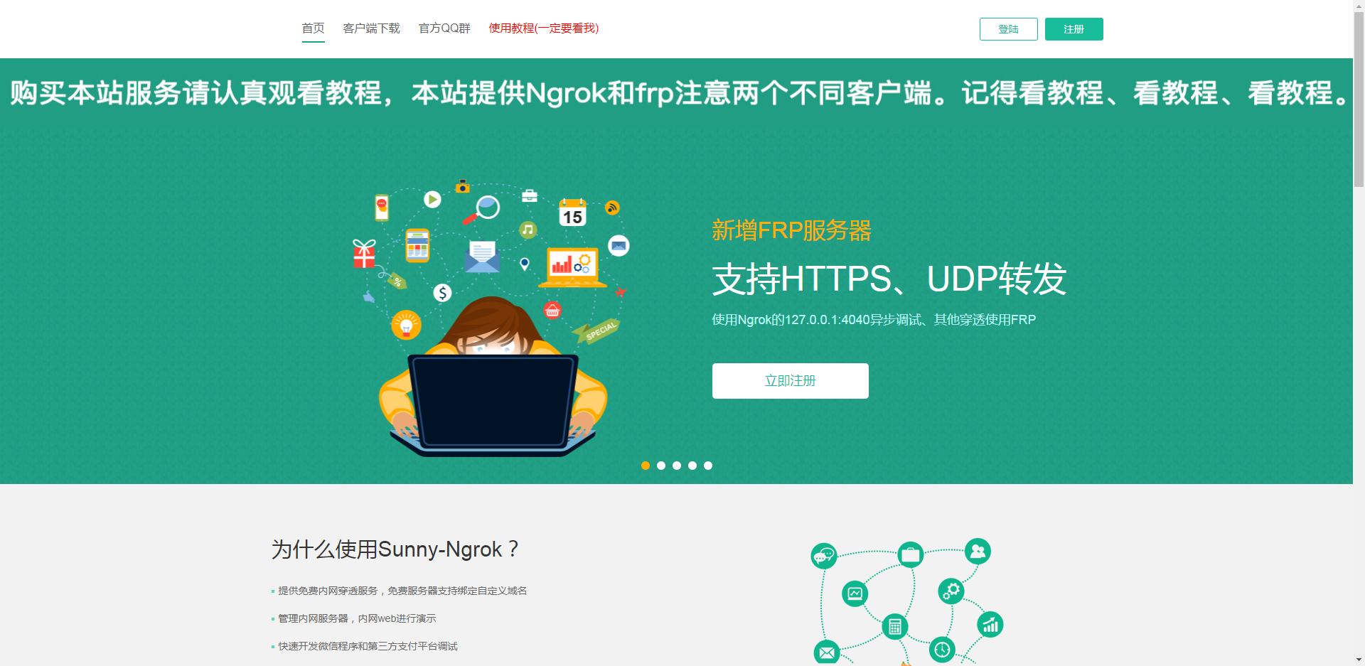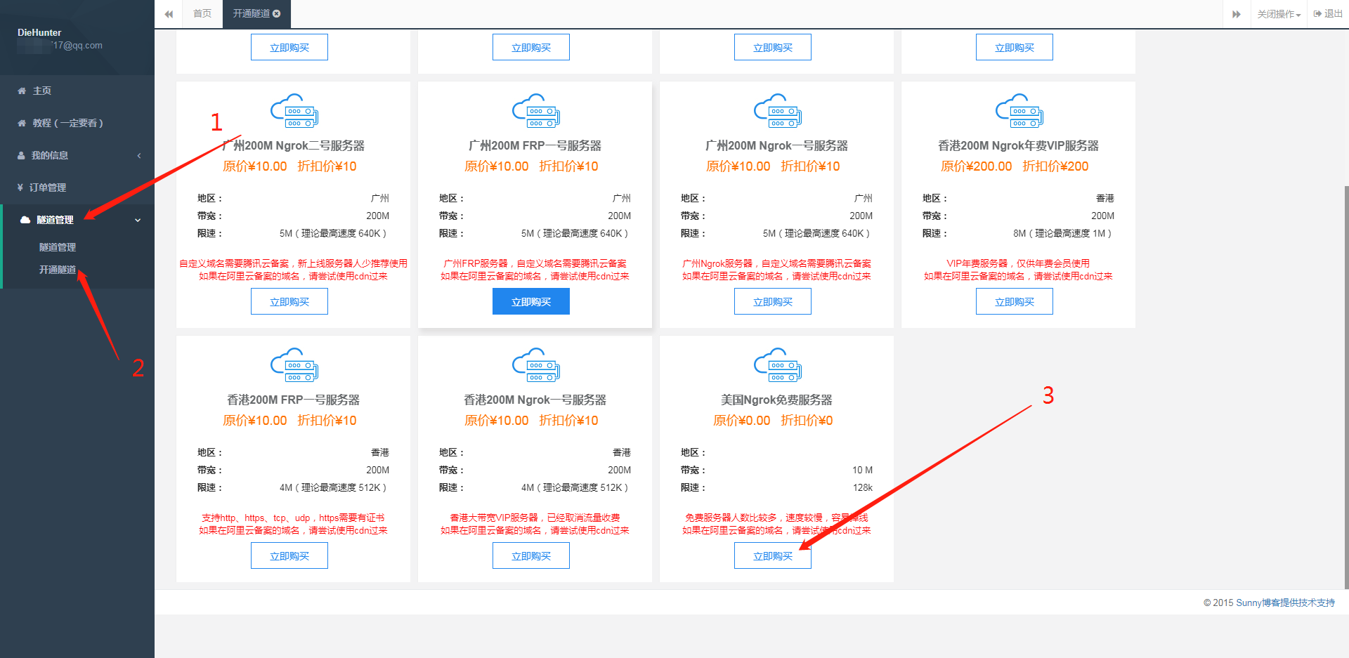 下一步,注册Sunny-Ngrok账号,登录并购买免费服务器,配置服务器设置,最后下载穿透软件
