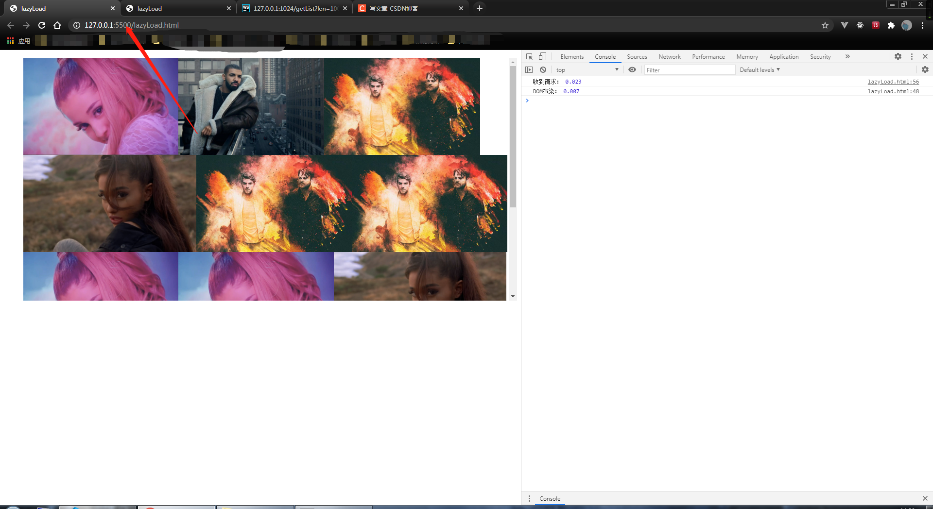 开启本地服务运行懒加载案例,通过127.0.0.1访问网页,我这里是运行在VSCode插件(live server)下,当然也可以参照静态文件服务把项目运行在node服务下,首先保证网页和接口可以在本地运行访问