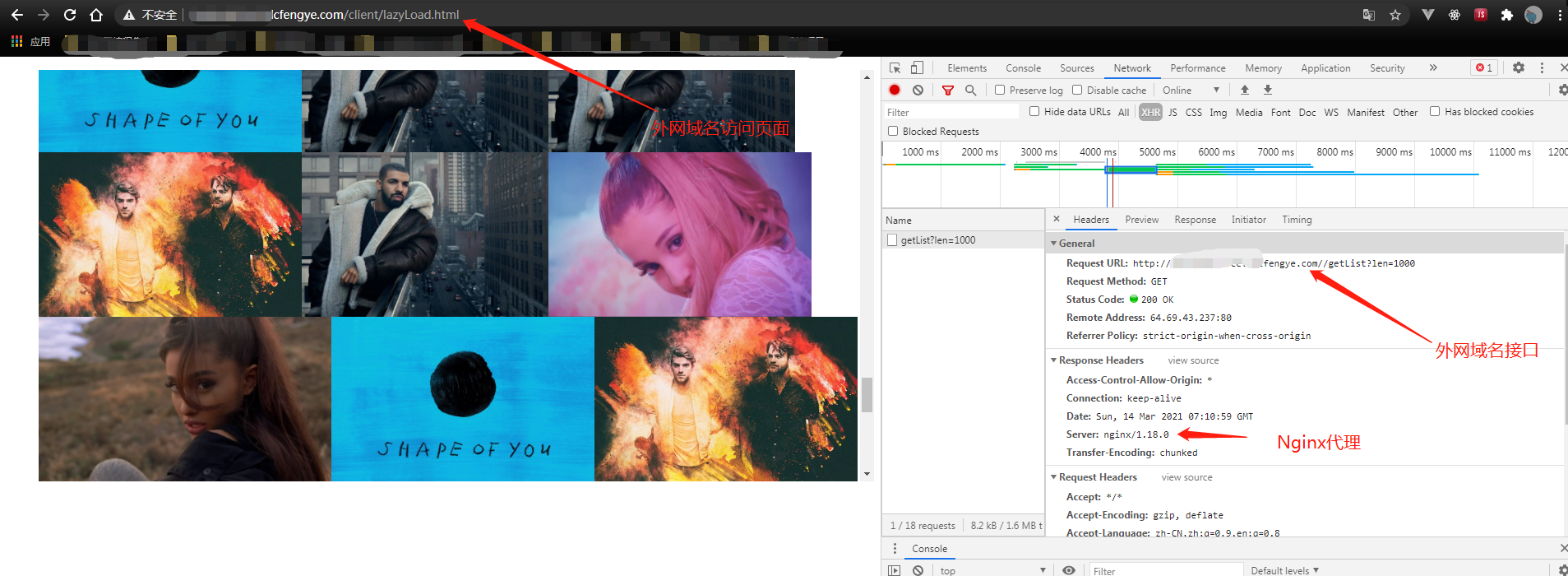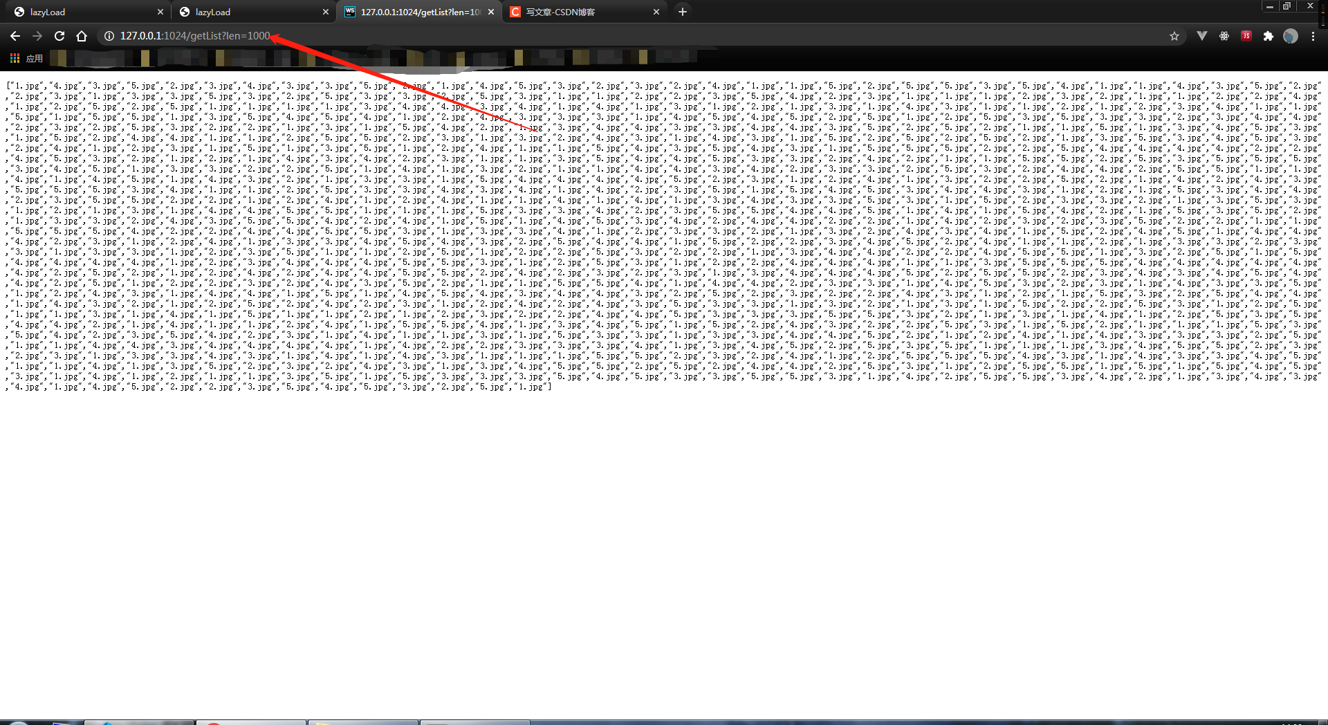 但是此时懒加载请求的接口是本地的127.0.0.1,我们要修改为http://example.com/getList?len=1000,最后打开http://example.com/client/lazyLoad.html,显示以下效果