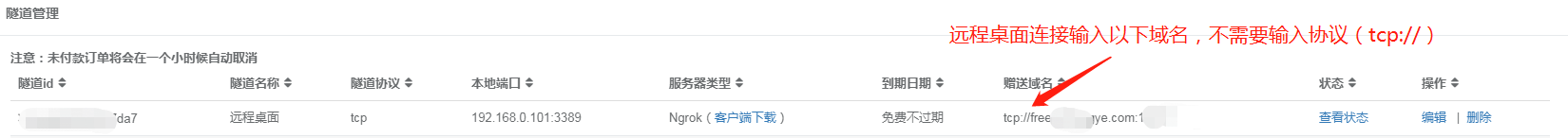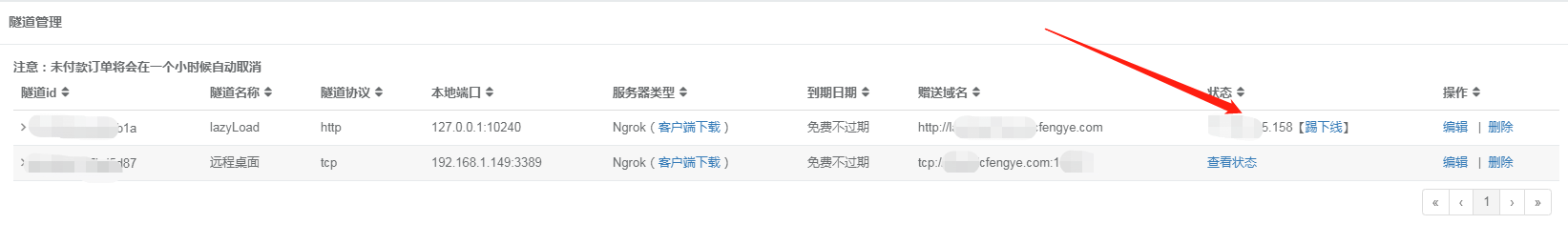 此时刷新隧道管理界面,点击查看状态,可以看到,当前连接的ip,说明内网穿透成功
