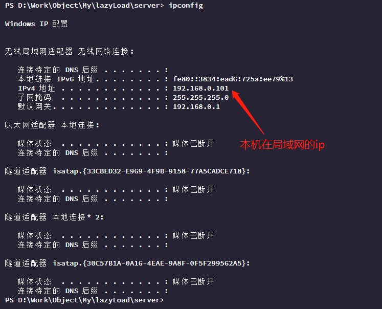 - 本地映射的ip不能使用127.0.0.1,而是使用局域网内的ip,通过ipconfig查看本机在局域网的ip并复制