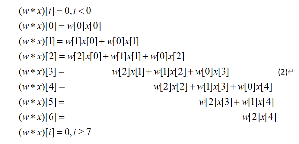 再以公式1的第三行为例,,此时i=-1, 先看W序列和X序列的元素序号,找到