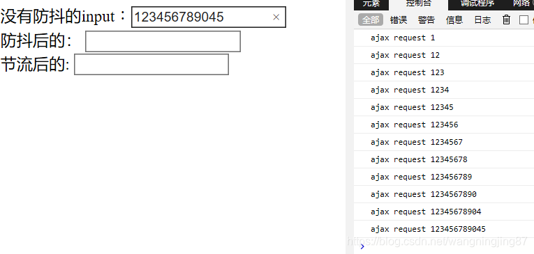 <body>没有防抖的input:<input type="text" id="unDebounce"><br>防抖后的: <input type="text"><br>节流后的: <input type="text"><script>//没有防抖的function ajax(content){console.log('ajax request '+content)}let inputa=document.getElementById("unDebounce")inputa.addEventListener("keyup",function(e){ajax(e.target.value)})//-----------------------------------------</script>