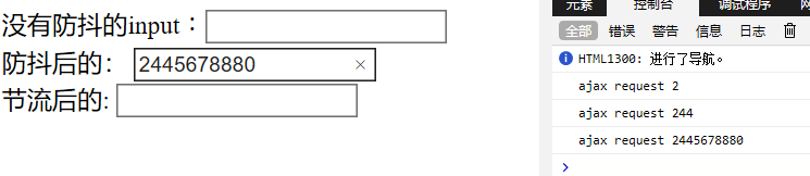 没有防抖的input:<input type="text" id="unDebounce"><br>防抖后的: <input type="text" id="Debounce"><br>节流后的: <input type="text"><script>//防抖的function ajax(content){console.log('ajax request '+content)}function debounce(fun,time){return function(args){let that=this;clearTimeout(fun.id);fun.id=setTimeout(function(){fun.call(that,args)},time)}}let inputDebounce=document.getElementById("Debounce")let debounceAjax = debounce(ajax, 500)inputDebounce.addEventListener('keyup',function(e){debounceAjax(e.target.value)})</script>