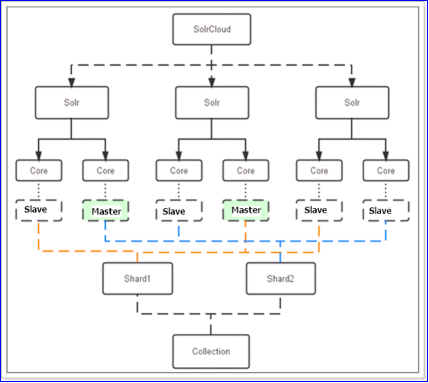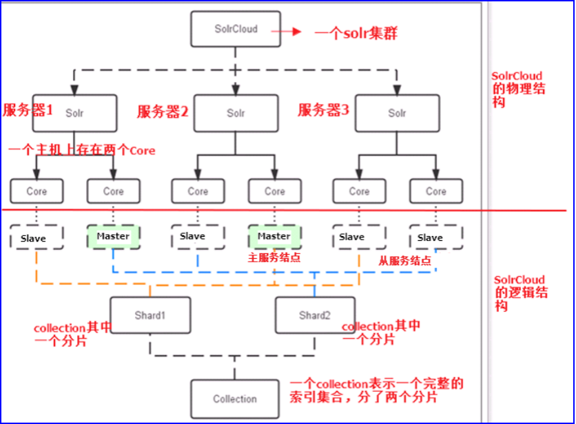 逻辑结构,整个solr集群只有一个完整的索引库Collection,一个索引库就是一个Collection,可以把一个Collection分散到多个服务器上存储,这时候就分片了,这里把它分成两片shard1、shard2。 然后再把这两片分开存储,一片可以存到一个solr core里,如把片Shard1分散存储到3个节点上,其中只有一个主节点Master,两个备份节点Slave,这样就可以高可用了,起其中如果主节点Master挂了,还有两个备份节点Slave。