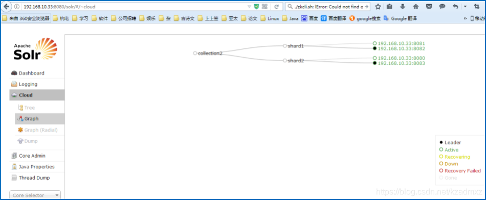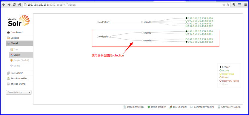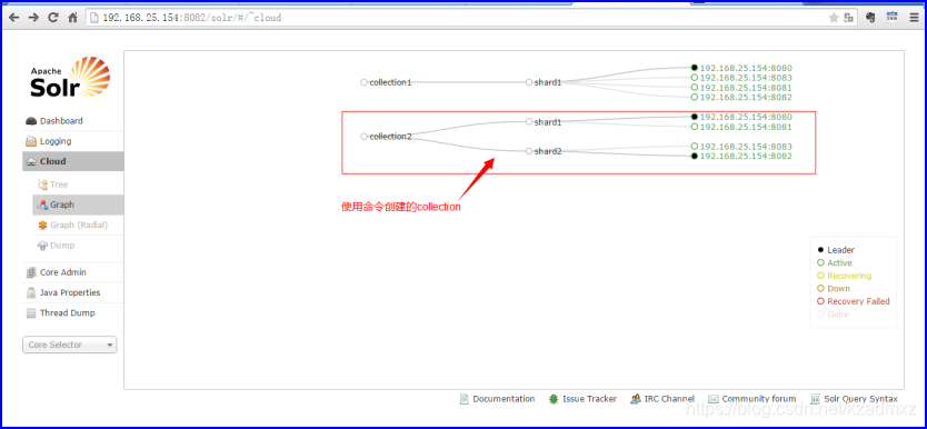 如果集群中有四个solr节点创建新集群collection2,将集群分为两片,每片两个副本。