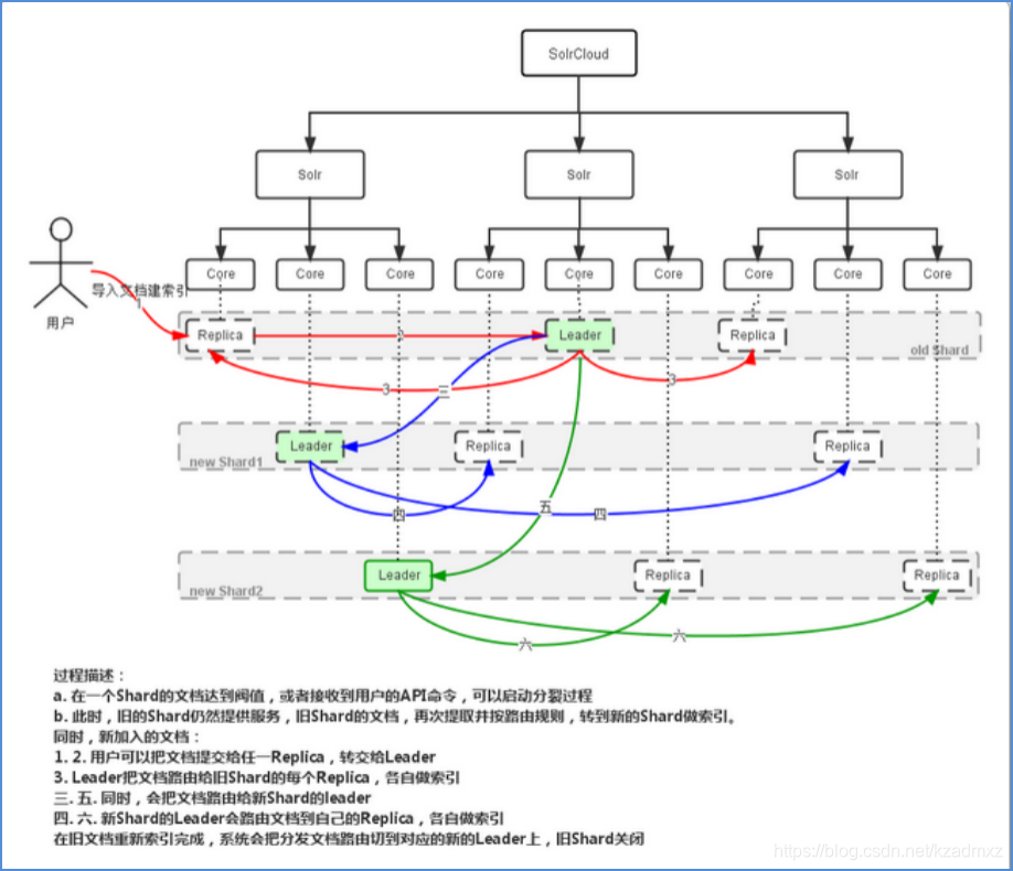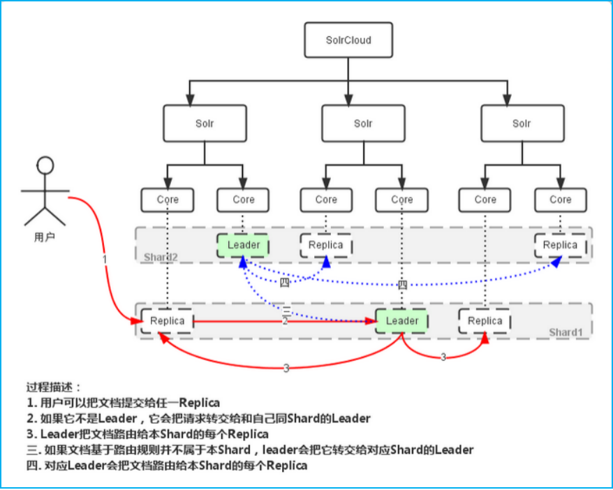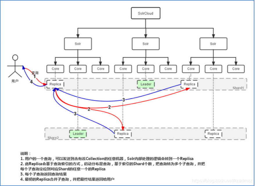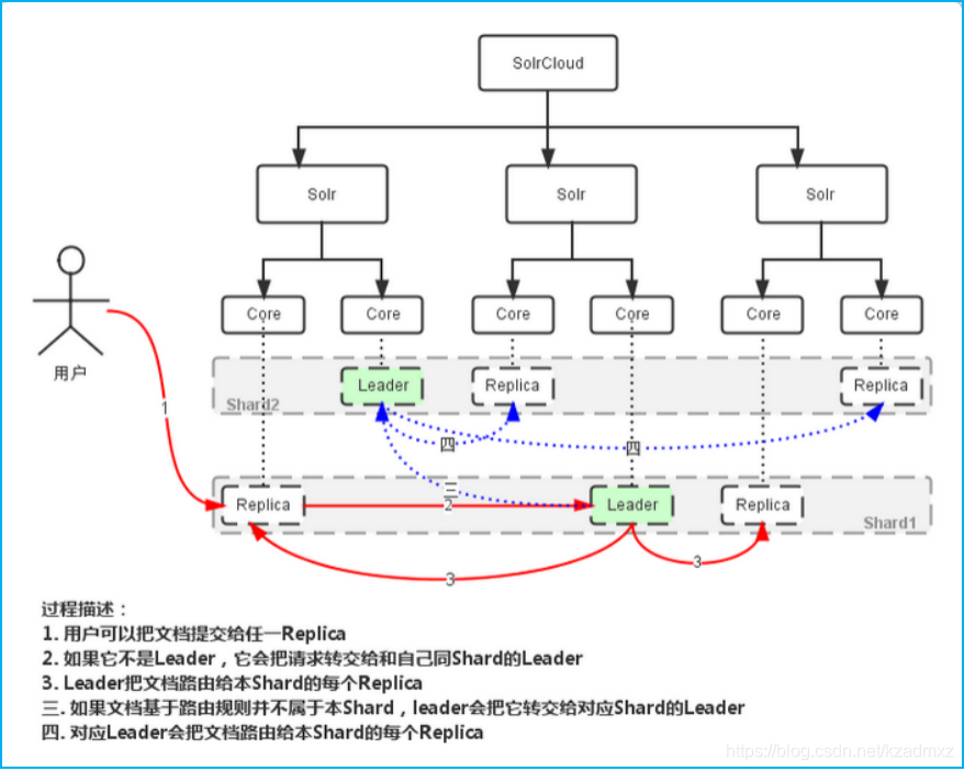 索引集合包括两个Shard(shard1和shard2),shard1和shard2分别由三个Core组成,其中一个Leader两个Replication,Leader是由zookeeper选举产生,zookeeper控制每个shard上三个Core的索引数据一致,解决高可用问题。