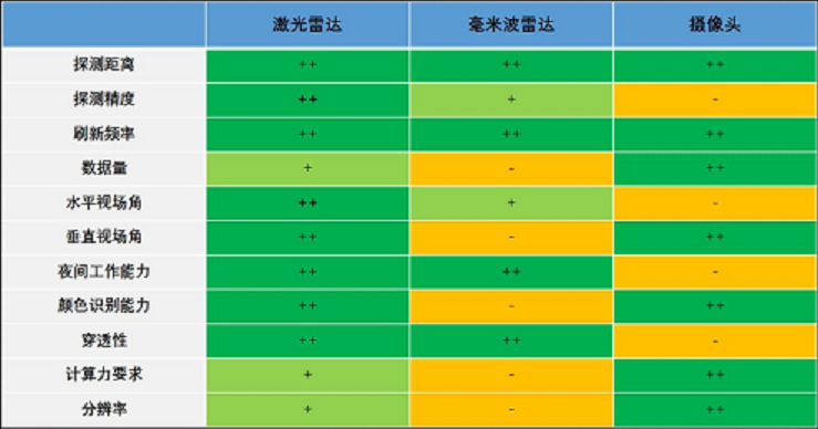 根据激光雷达的特性,与自动驾驶中其他常用的传感器对比如下: