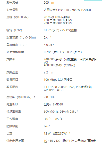 激光雷达的主要性能指标有激光波长、测量距离、测量精度、扫描频率、角分辨率、视场角、激光线束、安全等级、出点率、输出参数、IP防护等级、功率、供电电压、使用寿命等。如下图所示: