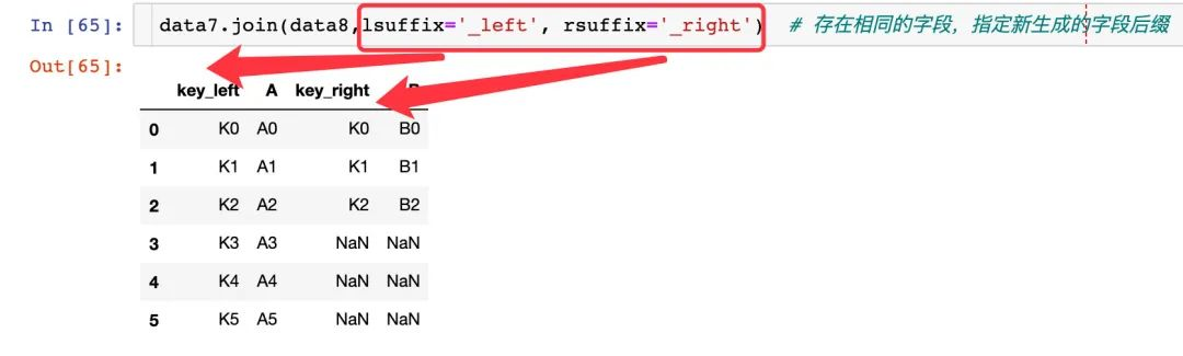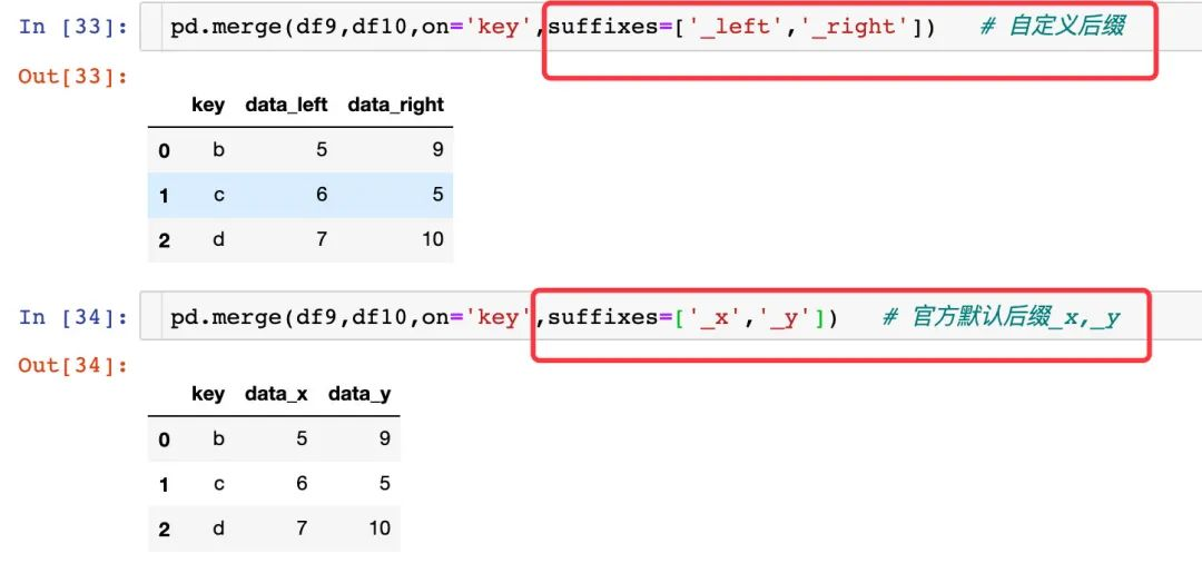 合并的时候一列两个表同名,但是取值不同,如果都想要保存下来,就使用加后缀的方法,默认是 _x,_y