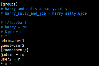 [groups]# harry_and_sally = harry,sally# harry_sally_and_joe = harry,sally,&joe# [/foo/bar]# harry = rw# &joe = r# * =admin=user1guest=user2[kuangshen:/]@admin=rwuser2=r