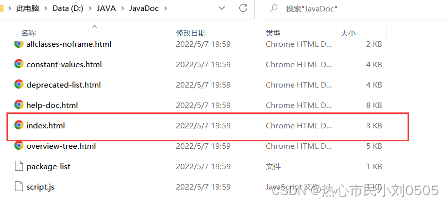 6.我们打开JavaDoc文件夹,发现多了一堆东西,但我们只需要找到index.HTML文件,并打开之后就能看到生成的API文档了。