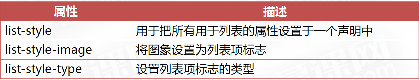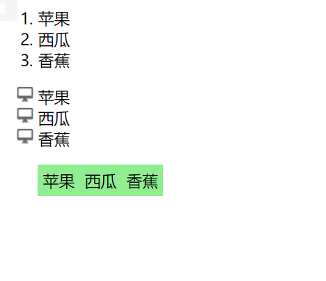 <head><meta charset="UTF-8"><title>列表</title><style>/* 设置列表项的预定义样式 */#u1 {list-style-type: decimal;}/* 设置列表项的图片样式 */#u2 {list-style-image: url("imgs/mac.png");}/* 设置列表项水平方向排列 */#u3 {list-style-type: none;}#u3>li {float: left;display: inline-block;background-color: lightgreen;padding: 5px;}</style>