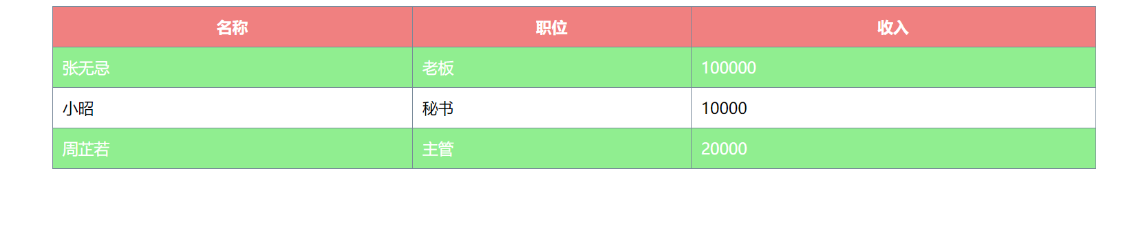 <table><tr><th>名称</th><th>职位</th><th>收入</th></tr><tr class="info"><td>张无忌</td><td>老板</td><td>100000</td></tr><tr><td>小昭</td><td>秘书</td><td>10000</td></tr><tr class="info"><td>周芷若</td><td>主管</td><td>20000</td></tr>