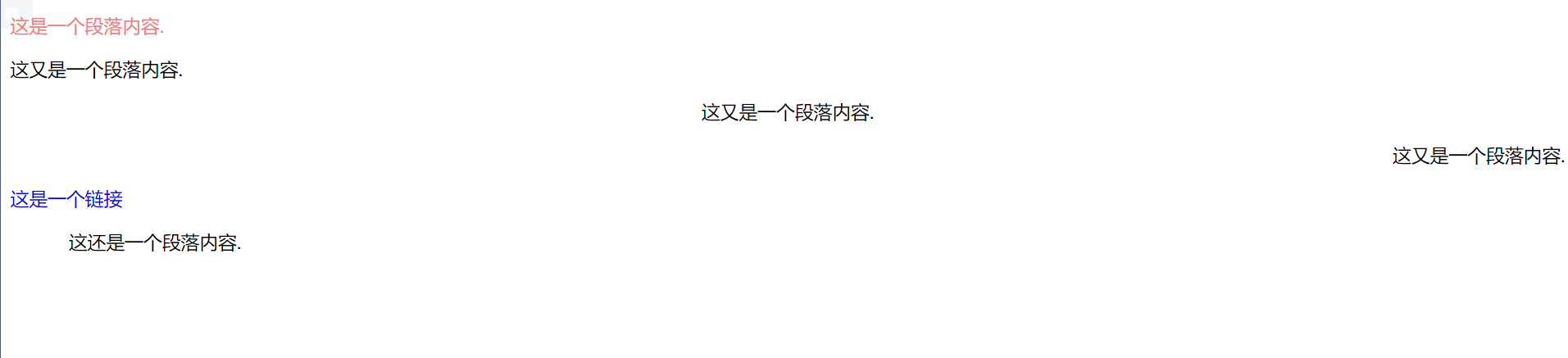 <head><meta charset="UTF-8"><title>文本</title><style>/* 设置文本颜色 */#p1 {color: lightcoral;}/* 设置文本左对齐 */#p2 {text-align: left;}/* 设置文本居中对齐 */#p3 {text-align: center;}/* 设置文本右对齐 */#p4 {text-align: right;}/* 设置链接样式去掉下划线 */a {text-decoration: none;}/* 设置文本的缩进 */#p5 {text-indent: 50px;}</style>