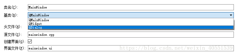 这里注意一下有三个选项。QMainWindow、QWidget、QDialog,我简单说一下他们的区别吧,MainWindow生成的窗口有菜单栏、工具栏等栏,而Dialog则是小窗口、一般是像弹出来的提示窗口、选择窗口等的,widget则是比较普通的,一般作为普通页面的。所以他们三者的关系为以widget为普通界面,然后切换窗口至Mainwindow表达最主要的内容,Dialog用于弹出一些小提示、一些选择的窗口。