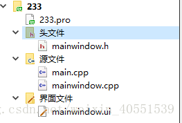 介绍一下,第一个.pro文件是一些系统等配置,一般不用理的,除了后面用到某些头文件需要在.pro中加一些模块的语句外,一般不用改变里面的内容。第二个就是头文件了,与下面的源文件.cpp文件对应,用于类的声明,.cpp文件中用于类函数的实现。main函数没有头文件。下面的ui文件则是用于绘制窗口的样子,比直接用代码敲要简单,更易于去美化界面与定位。然后就是一般不修改main函数中的东西。