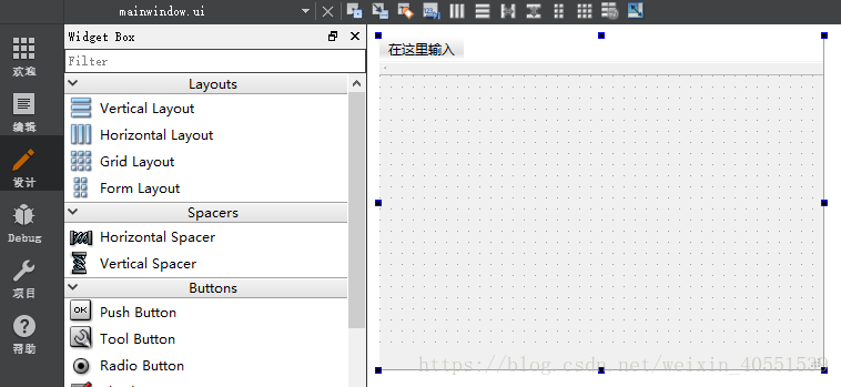 右边的一块是窗口的样子,实际运行时没有点点的,这些点点是为了容易定位,有时候也很不方便。左栏为各种组件,点着需要的组件拖到右边的界面上就会有了。正常情况下,ui界面的东西会覆盖在用代码直接实现的东西上。