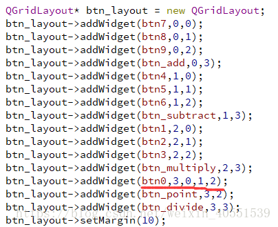 btn后加一个数字是我创建的QPushButton组件,后面的两个数字为所在的行数与列数,再后两位是所占行数与列数,默认为1,可以自己改。