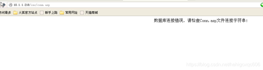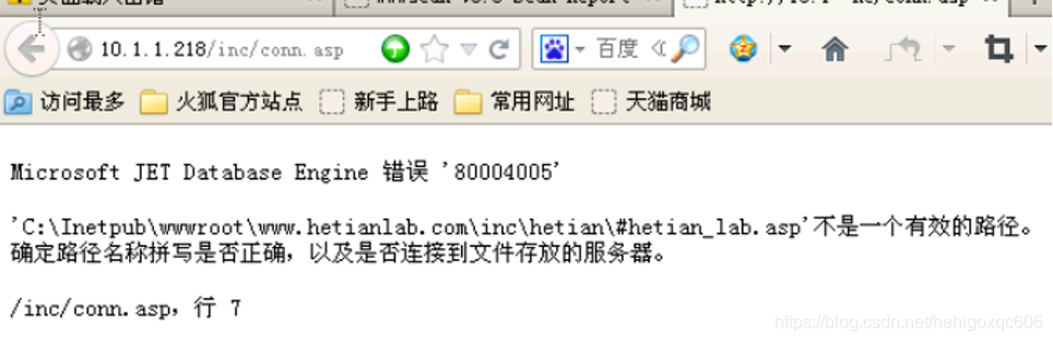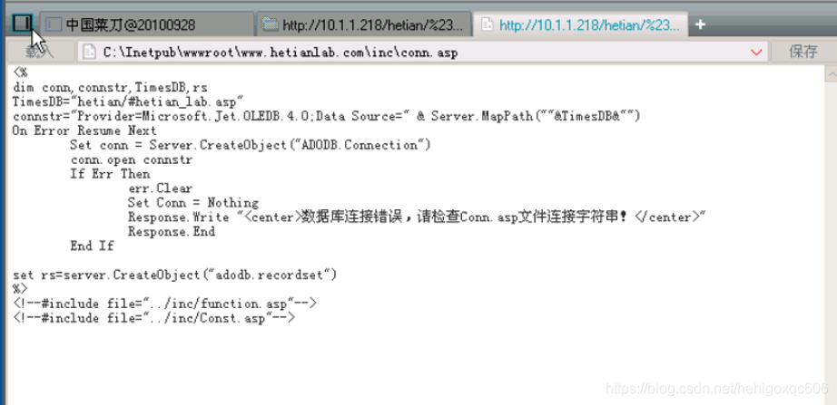 访问10.1.1.218/inc/conn.asp,可以直接暴出网站数据库地址,说明存在漏洞,如下图所示,这是一个后缀名为.asp的数据库