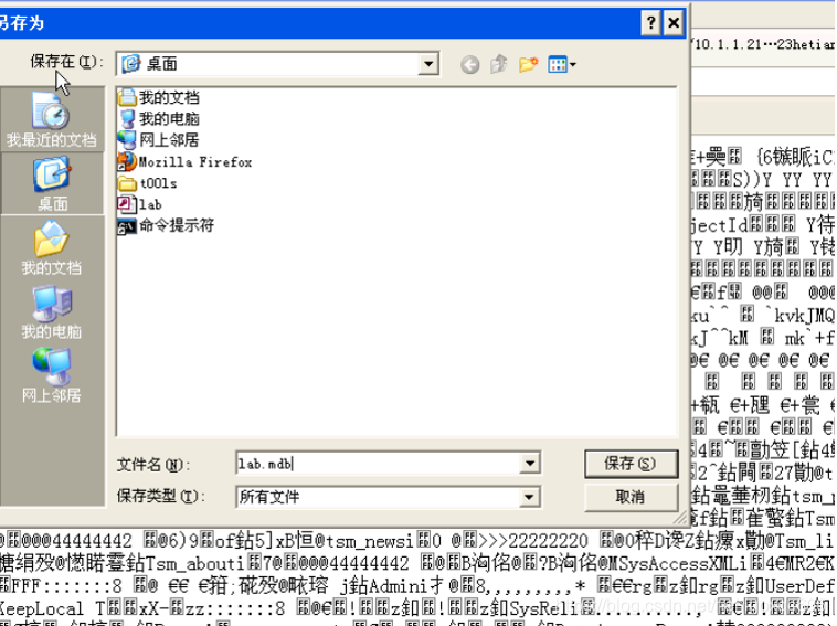 5)可见,可以访问数据库,通过火狐浏览器把它下载下来,在此页面按住CTRL+S,弹出保存框,保存类型选择为所有文件,文件名后缀 改为.mdb。点击保存