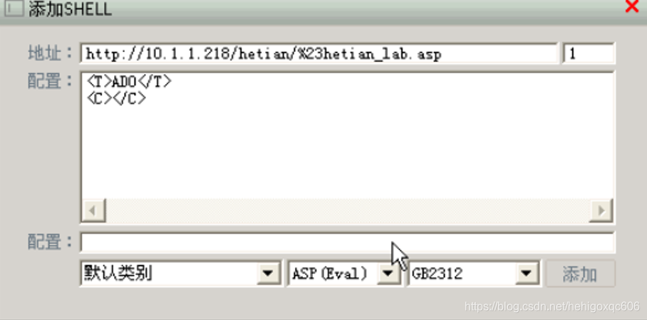 3)打开中国菜刀,右击添加,地址栏填入数据库地址为http://10.1.1.218/hetian/%23hetian_lab.asp