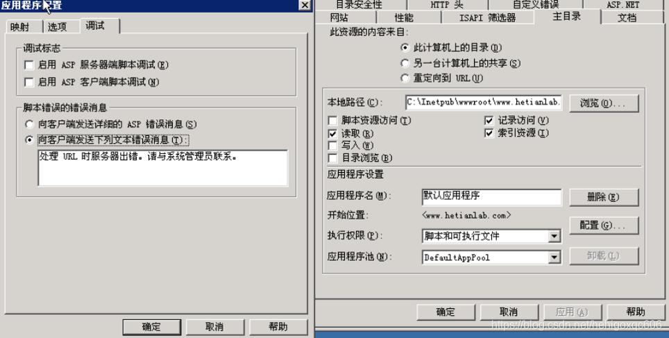 进入服务器的主机,通过点击开始->管理工具->Internet信息服务(IIS)管理器,打开IIS服务器,先查看网站的“属性”(在网站名称处右击选择属性即可),选择“主目录”标签项,在其中“执行权限”的右侧,点击“配置”按钮,弹出“应用程序配置”对话框,我们选择“调试”标签项,在这页面我们需要关注的是“脚本错误的错误信息”,具体如下图所示: