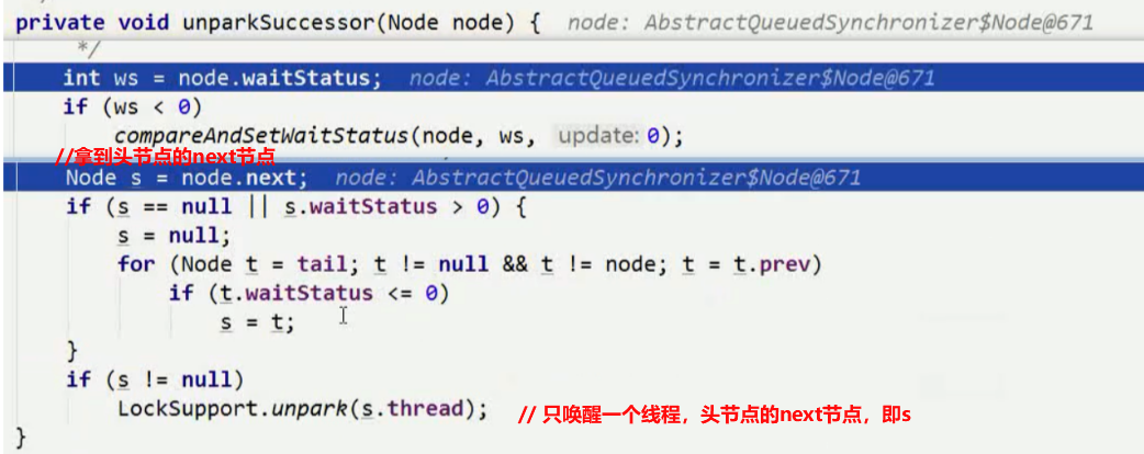 当线程释放资源的时候,会获取到同步队列中的头节点的next节点(因为头节点是当前线程),将next节点设置为头节点,并调用unpark()唤醒新头节点的线程去获取锁资源。