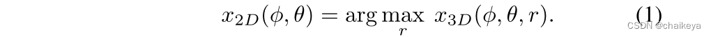 还在生成器中使用跳过连接[50]。跳过连接为解码器的更高层提供来自编码器输入层/早期层的高频信息。虽然这在将2D映射到2D或3D映射到3D的网络中很简单,但我们的网络学习3D到2D的投影。因此,我们的跳过连接设计将输入的3D热图投影到2D图像中,该图像与解码器的更高层连接。该投影如下所示。我们通过记录沿投影在该位置的光线的最大值对应的位置来计算以下2D图像: