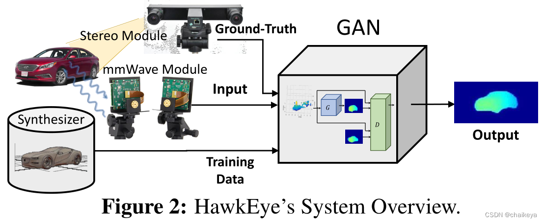 作者基于引入背景噪声的点反射器模型模拟接收信号。在毫米波信号中加入了热噪声和相位噪声。此外,为了避免在实验设置中对毫米波和立体相机模块之间的场点和视点进行异常的外部校准,作者将相同的位移导入到合成器中以在立体相机视点进行预测,并准确地训练与测试 HawkEye 的 GAN 架构。
