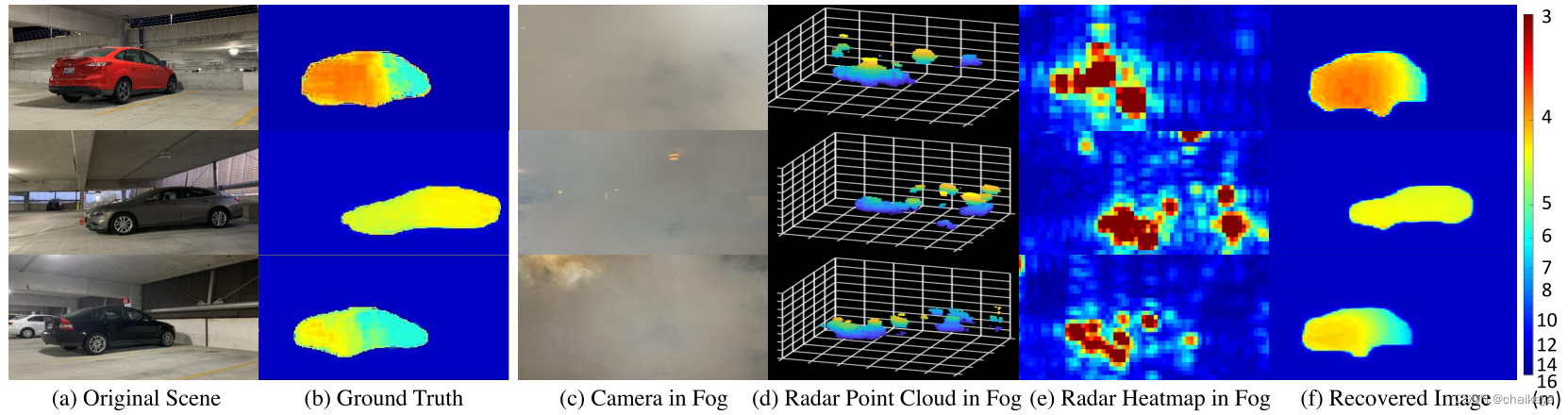 自动驾驶汽车:使用毫米波雷达,可以在浓雾中感知和预测汽车的形状(图1(f)所示)。