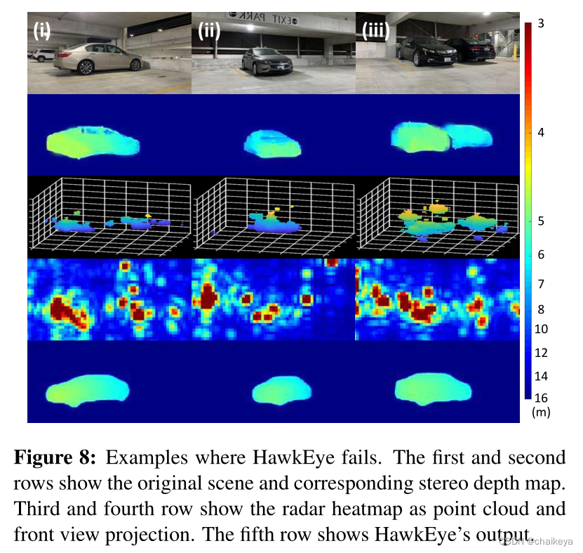 图8显示了HawkEye的一些典型故障案例。(i) 和(ii)来自雾实验。在(i)中,虽然HawkEye估计了正确的边界框,但它错误地判断了汽车的前部和后部。在(ii)中,尽管HawkEye成功地检测到了汽车的角落,但由于热图中的强虚拟反射和镜面反射,它错误地估计了汽车的方向。最后,我们系统当前的一个限制是,当场景中有多辆车时,其性能会恶化(图8(iii))。为了解决这个问题,未来的一个潜在方向是采用类似于[64]的区域建议网络,HawkEye可以首先从场景中的汽车中分离反射,然后分别重建每辆汽车。