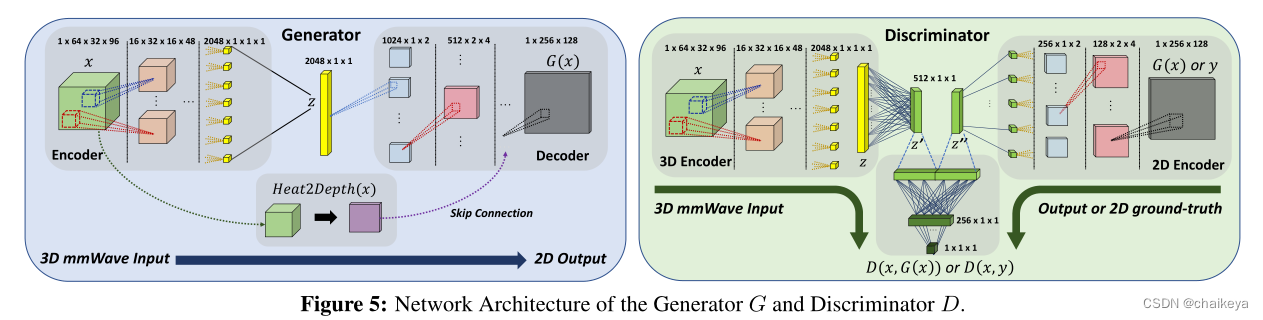 总的来说:给定输入的毫米波雷达射频热力图x,学习一个条件生成器(conditional generator) G。这个条件生成器采用了encoder-decoder结构。虽然毫米波热图的空间分辨率较低,但由于其较大的传感带宽,可以在depth这一维度上实现较高的分辨率。为了在深度上保留这些高频(high-frequency)细节,在设计中使用了skip-connection。本文基于判别器D 的输入为成对的 (x, y) 和 (x,G(x)) ,并学习如何区分它们。